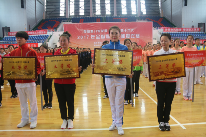 (集團黨群部 訊 劉麗萍/文攝)為認真貫徹落實全民健身綱要精神,喜迎黨的十九大順利召開,營造青海物產"全民健身、快樂工作、健康生活"的良好氛圍,展示廣大干部職工積極向上、團結協作、開拓創新、務實奮進的精神風貌。在集團黨委領導的高度重視下,在所屬公司的大力支持下,青海物產集團代表隊于2017年9月26日參加省總工會舉辦的"凝心聚力促發展、喜迎黨的十九大"全省職工工間操比賽,在26支參賽隊伍中脫穎而出,取得第三名(三等獎)的好成績。