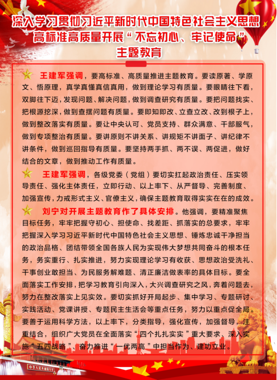 由集團黨委副書記、總經理劉玲同志宣讀《集團黨委開展"不忘初心、牢記使命"主題教育實施方案》。集團黨委書記、董事長王玉輝同志作了"不忘初心、牢記使命"主題教育動員講話,對集團系統開展主題教育工作進行了安排部署,要求把主題教育與完成本單位轉型升級、項目建設、生產經營等工作任務結合起來,切實把主題教育成果轉化為企業發展的強大動力,推動青海物產高質量發展。省委"不忘初心、牢記使命"主題教育第十二巡回指導組組長任正德同志做了指導講話。充分肯定了集團黨委的前期工作,認為會議準備比較充分,有效統一了干部職工的思想,制定的主題教育《實施方案》操作性強,目標任務具體,動員講話政治站位高,思想認識深,工作思路清晰。同時,結合工作組的職責就落實主題教育各項任務講了六點意見。一是聚焦根本任務;二是把握"十二"字總要求;三是緊扣"五句話"總目標;四是落實"四個貫穿";五是抓實"六項重點"舉措;六是力戒形式主義,嚴禁主題教育走形式、走過場。