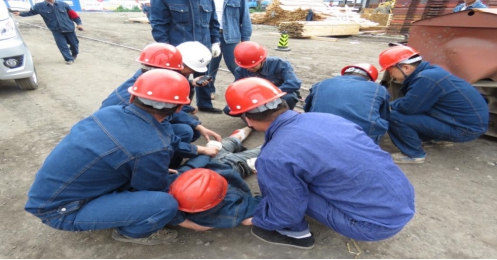 演練共分為參加演練人員集結、現場模擬人員受傷、采取止血包扎處理、現場管理人員發現事故后立即向指揮組匯報情況、指揮組接到通知后立即組織現場救援、各應急小組迅速趕往事故地點、應急救護組對傷者進行簡單救護后將傷者送往醫院、事故處理組對事故進行初步調查等過程。