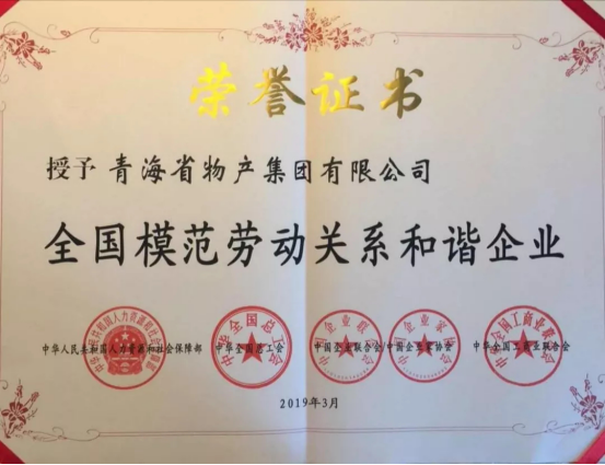 由青海省人力資源和社會保障廳、青海省總工會、青海省企業聯合會/企業家協會、青海省工商業聯合會共同推薦申報,青海省物產集團有限公司、青海互助青稞酒股份有限公司、正平路橋建設股份有限公司榮獲全國模范勞動關系和諧企業光榮稱號,西寧經濟技術開發區東川工業園區榮獲全國模范勞動關系和諧工業園區光榮稱號,受到了國家人力資源和社會保障部、中華全國總工會、中國企聯、全國工商聯的隆重表彰。