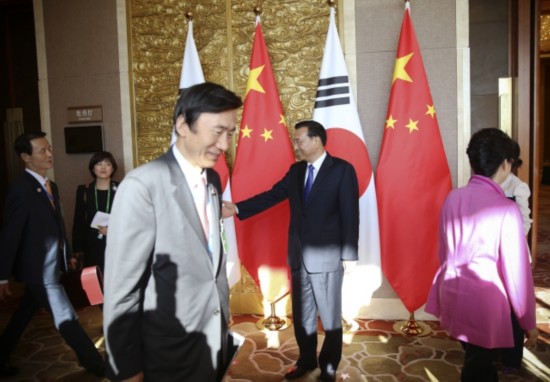 韓國總統樸槿惠對李克強總理表示:"韓中日三國合作有利于地區和平穩定。要引導日本抱著正確的歷史觀,為東北亞和平做出貢獻。"
